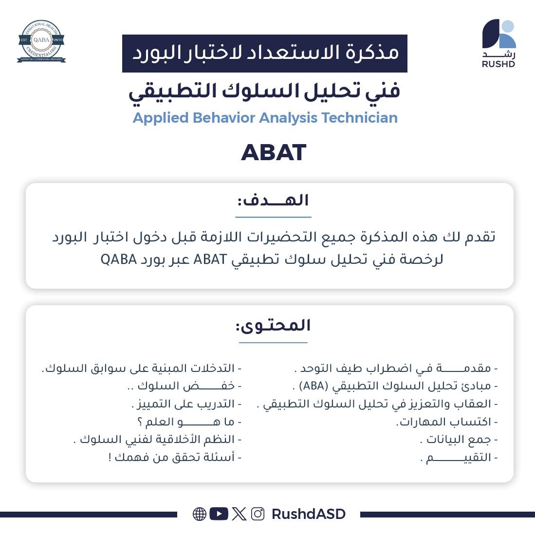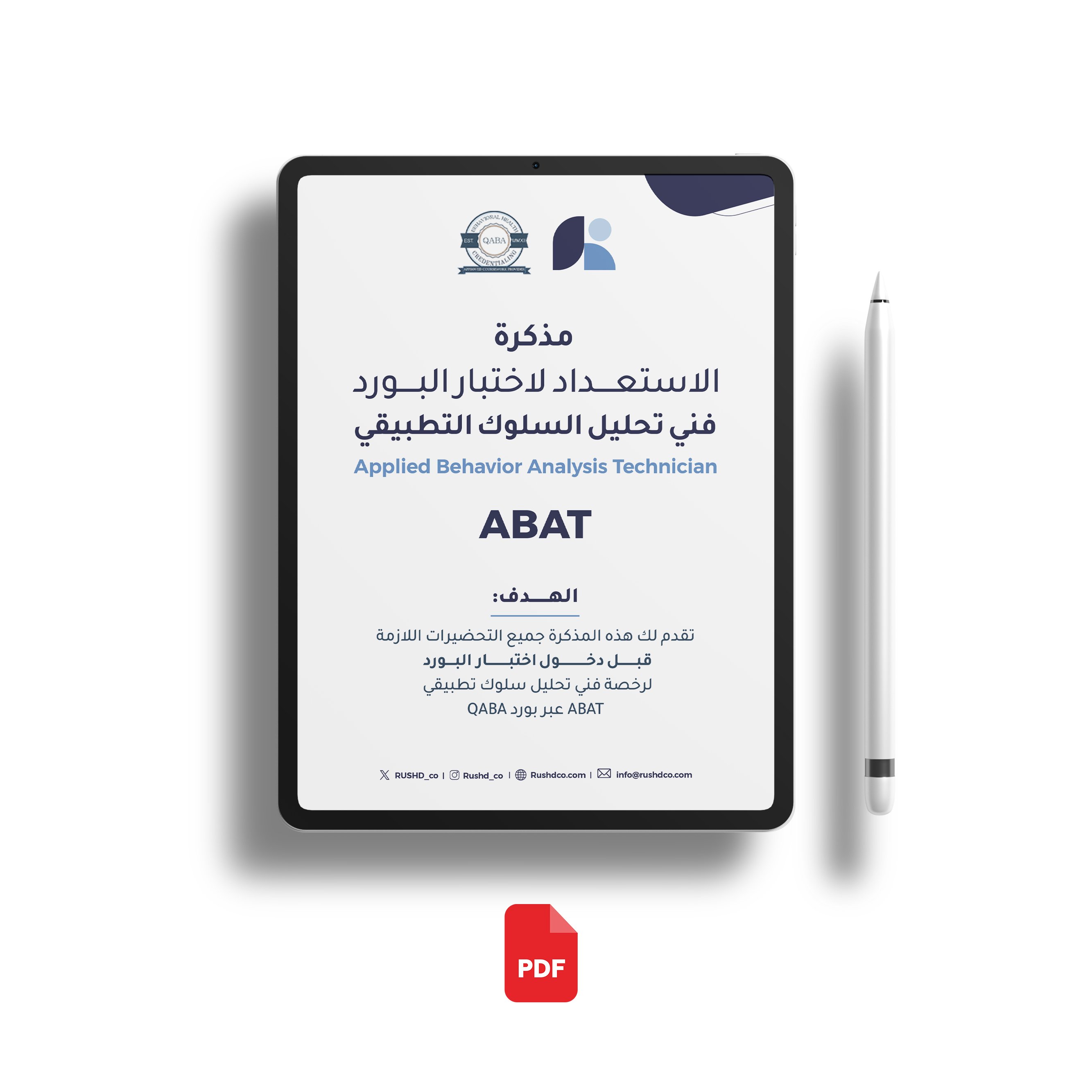 تقدم هذه المذكرة لفني تحليل السلوك جميع التحضيرات اللازمة قبل دخول اختبار البورد لرخصة فني تحليل سلوك تطبيقي ABAT عبر بورد QABA ضمن 211 صفحة