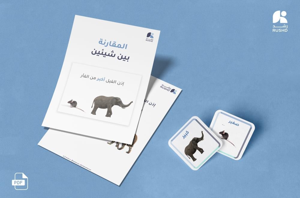 يقوم الطفل بصياغة الإجابة بأسلوب المقارنة مثلاً: الفيل أكبر من الفأر باستخدام البطاقة المساعدة ، و بعدها يقوم بحل الأنشطة المرافقة بدون مساعدة