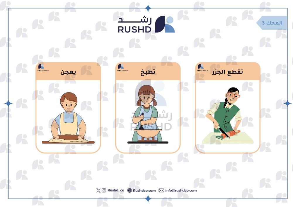 اعرض 3 صور ( يفتح الباب, تفتح العلبة, ترتب السرير )
