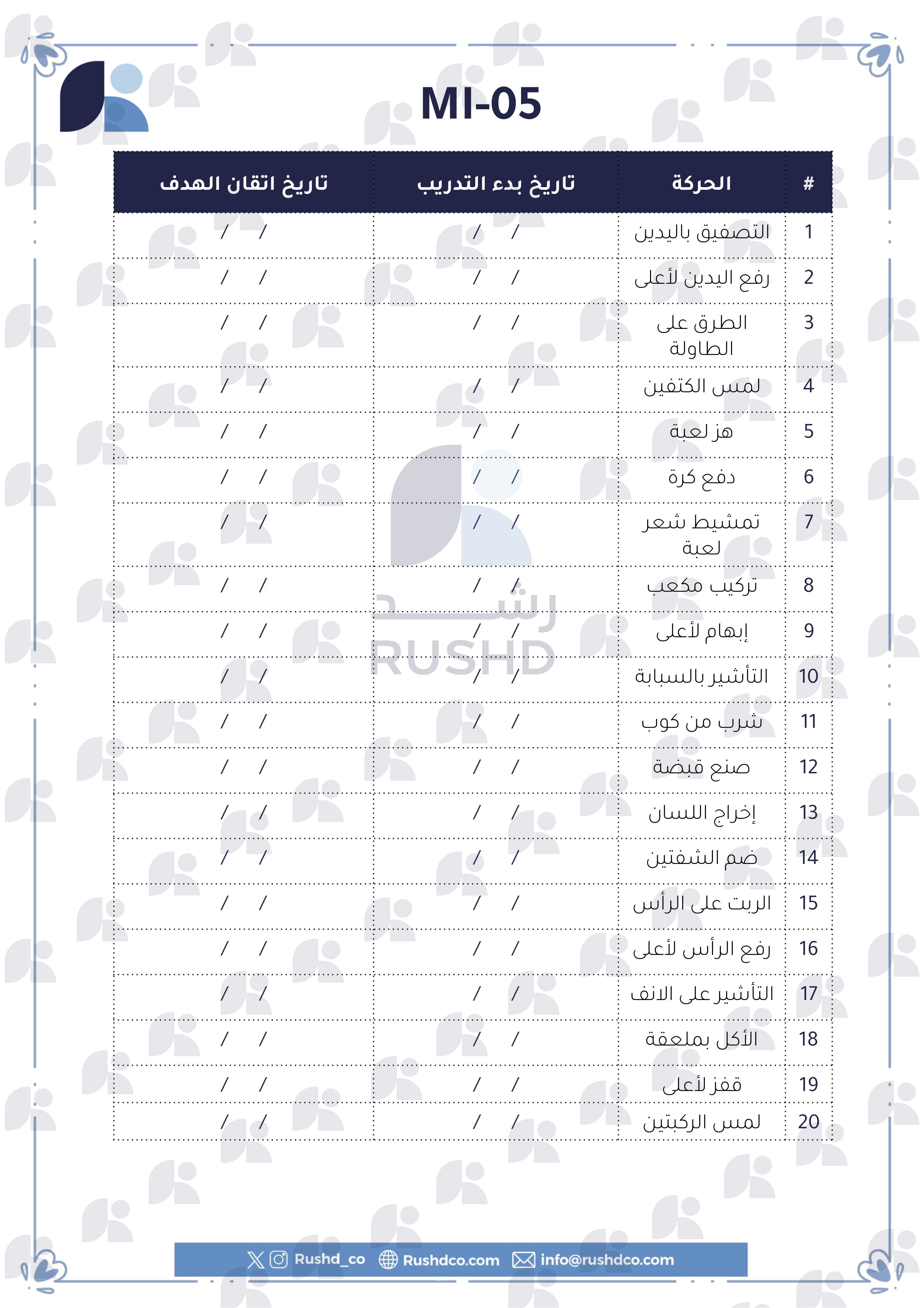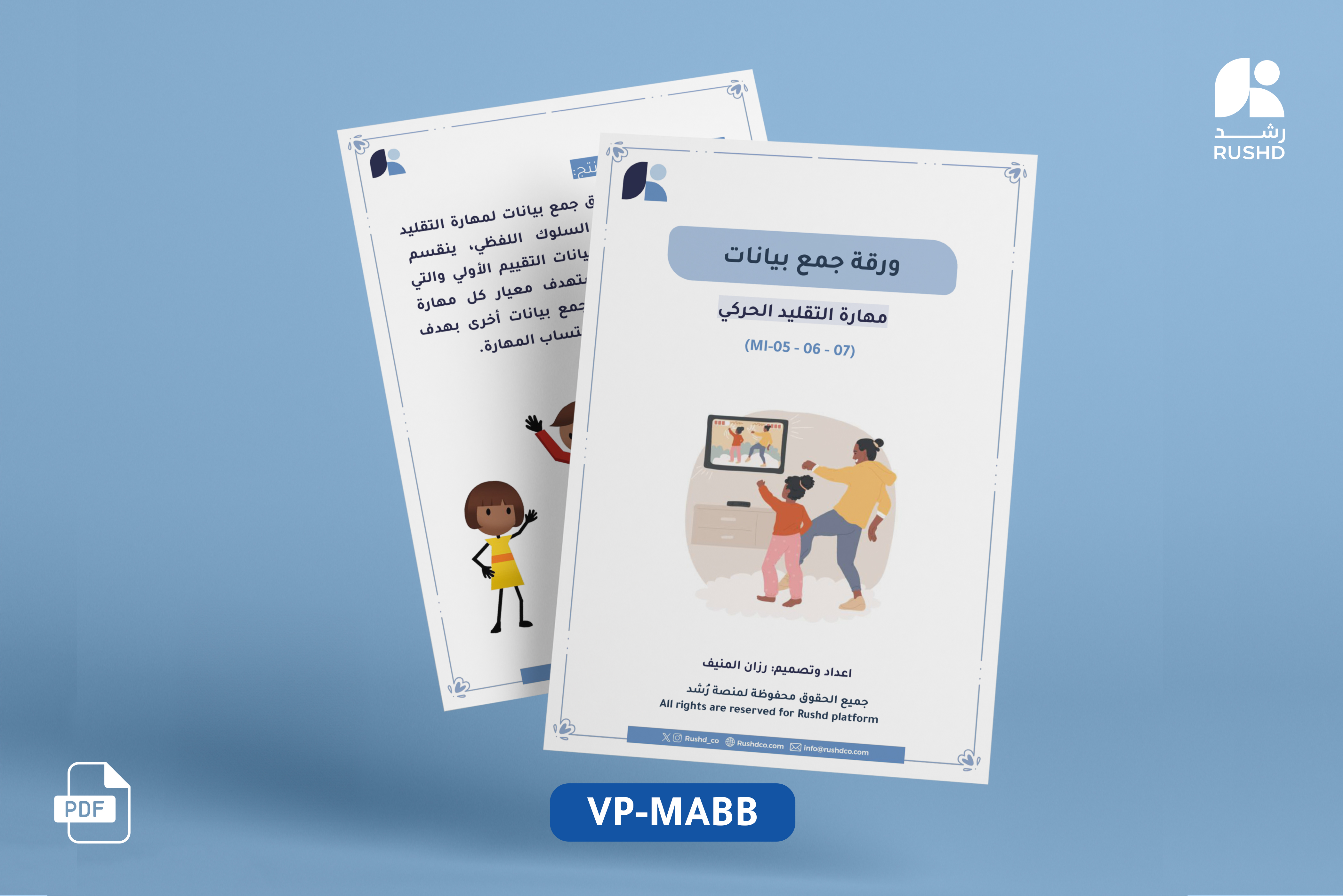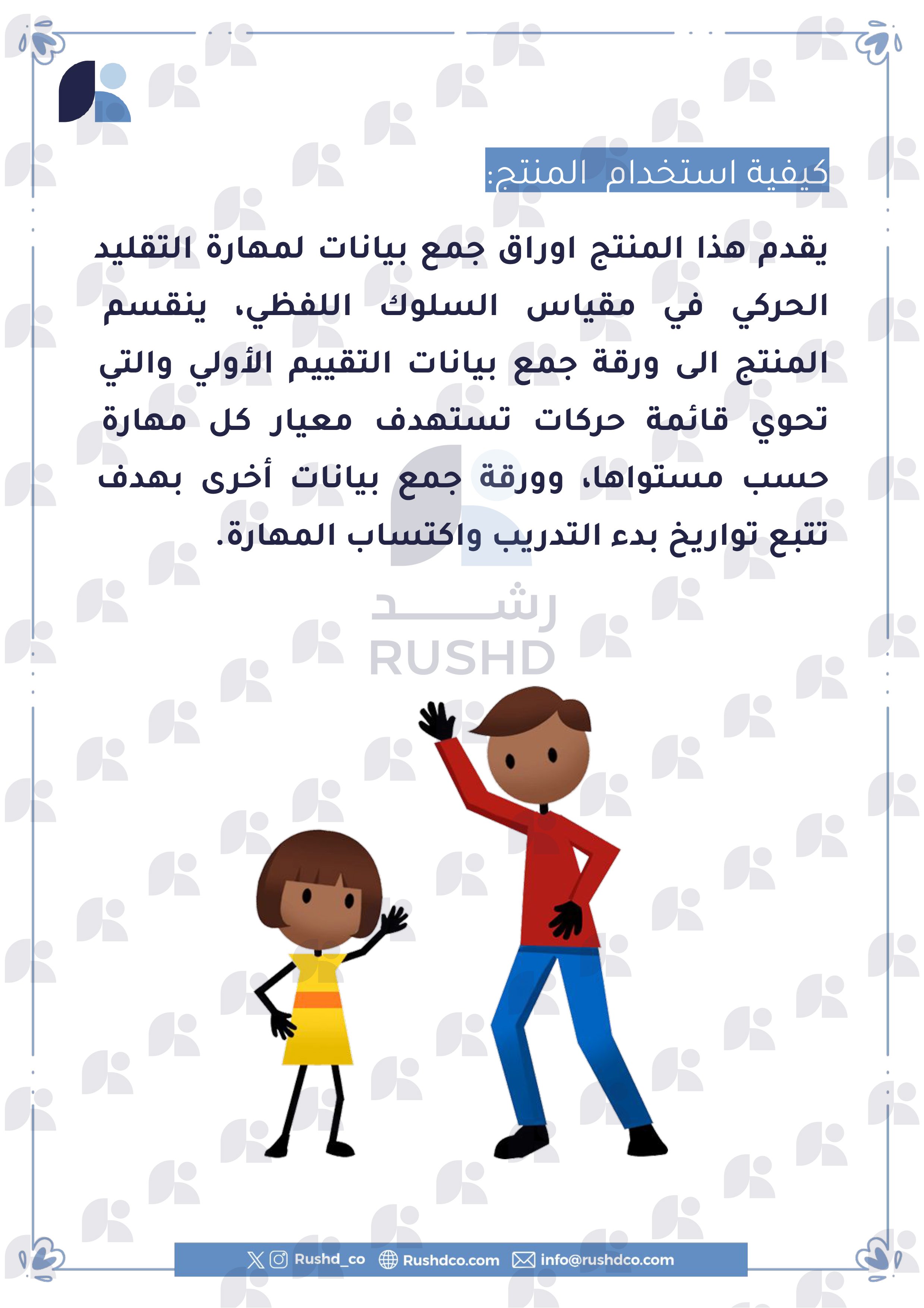 يقدم هذا المنتج ورقتين جمع البيانات من مهارة التقليد الحركي في مقياس السلوك اللفظي، ينقسم المنتج الى ورقة جمع بيانات التقييم الأولي والتي تحوي قائمة من 50 حركة تستوفي معيار الهدف، وورقة جمع بيانات أخرى بهدف تتبع تواريخ بدء التدريب واكتساب المهارة